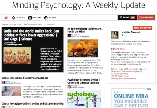“Minding Psychology: A Weekly Update”, by Natalie Stewart: a free, online newspaper with a curated selection of articles, blog posts, videos and photos pf interest to psychology students and professionals.